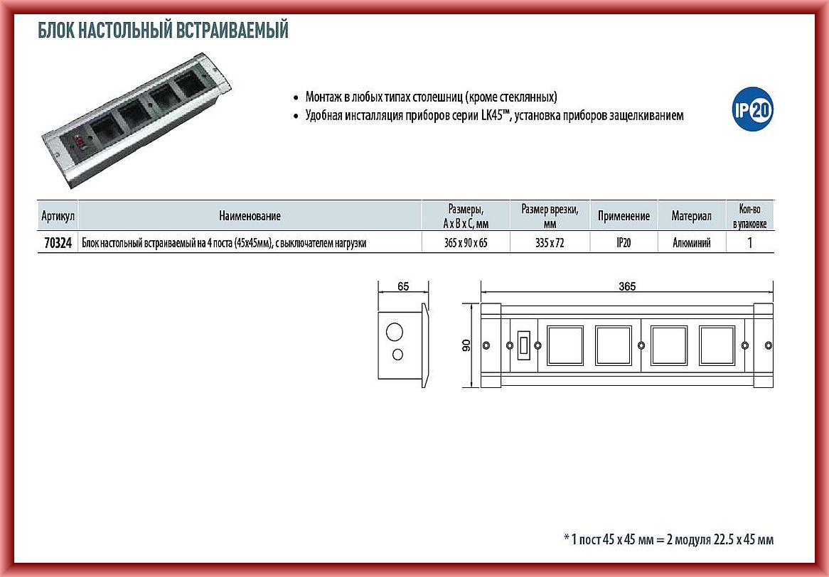 Блок настольный встраиваемый, с выключателем нагрузки на 4 поста для креп. к столу (алюминий), IP20