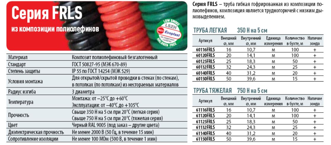 | 60116FRLS | Труба FRLS гофр. с зондом низкое дымовыделение трудногорючая д.16 | 100 м/уп | 28.50 | 25.65 |
