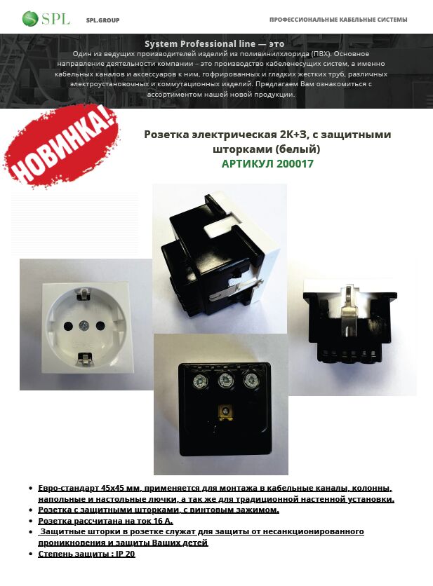 | D200017 | Розетка 2К+3 белая (со шторками) | 10 шт/уп | 360.16 руб/шт | 252.11 руб/шт |